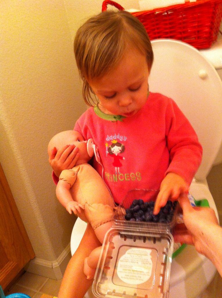 I didn't know if she was asking to go peepee, asking for beebees (blueberries) or wanting to hold her baby. They all sound the same right now, so I gave her everything...